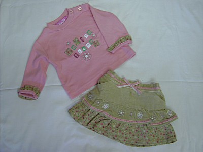 Pink Long Sleeve Top with floral cuffs and 2 pretty pink flower buttons on the left shoulder and the words "PeTiTe fLoWeR" on the front