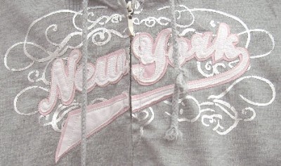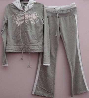 Pants have double waistband with drawstring, white stripe down each leg, New York motif on back