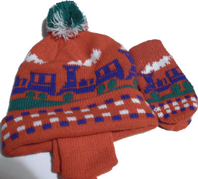 Bobble hat with train detail with matching mittens